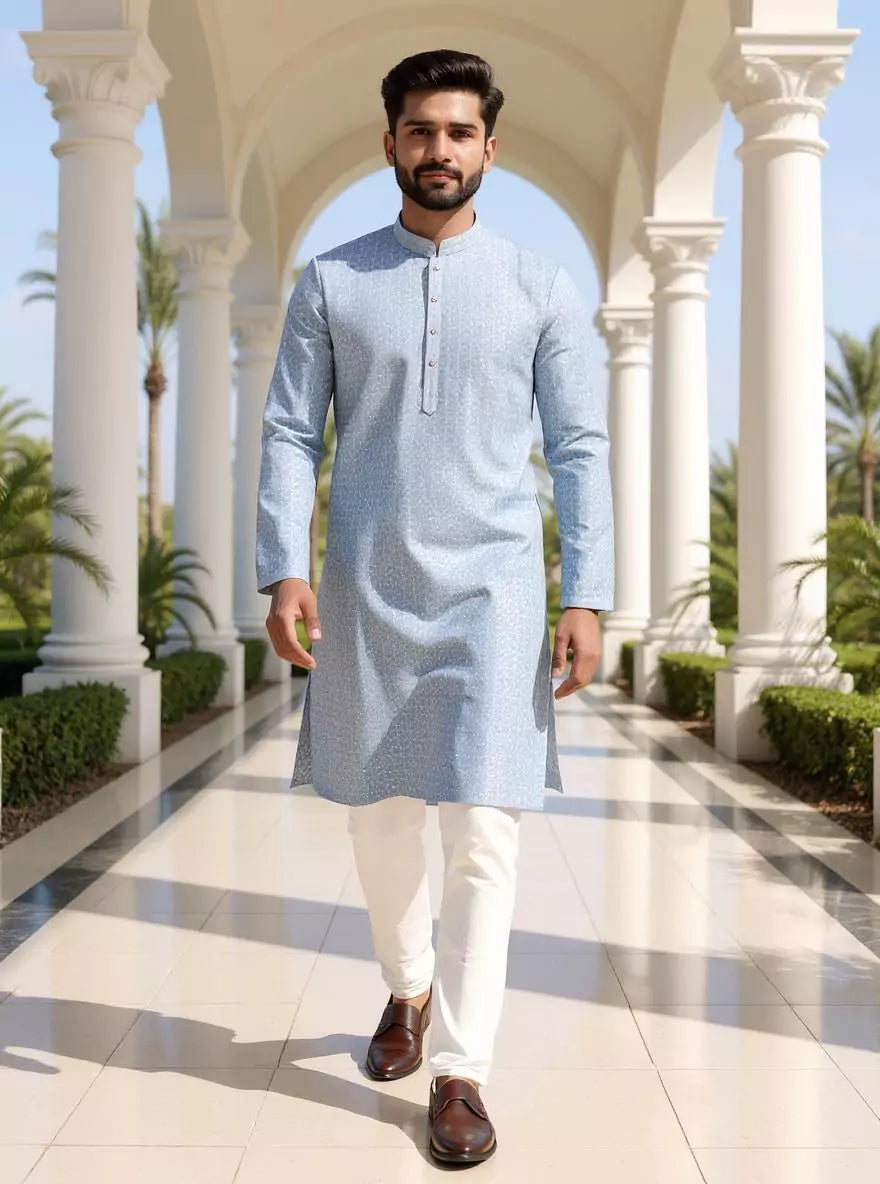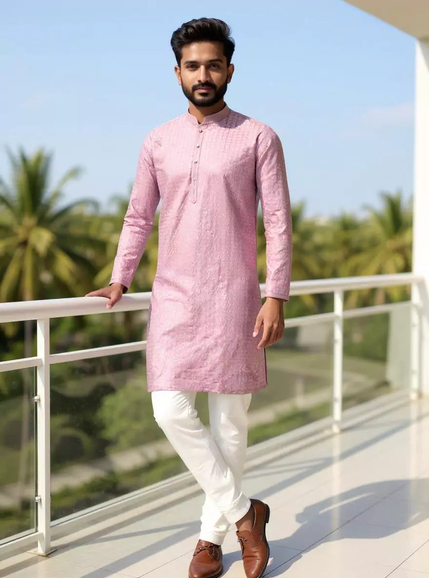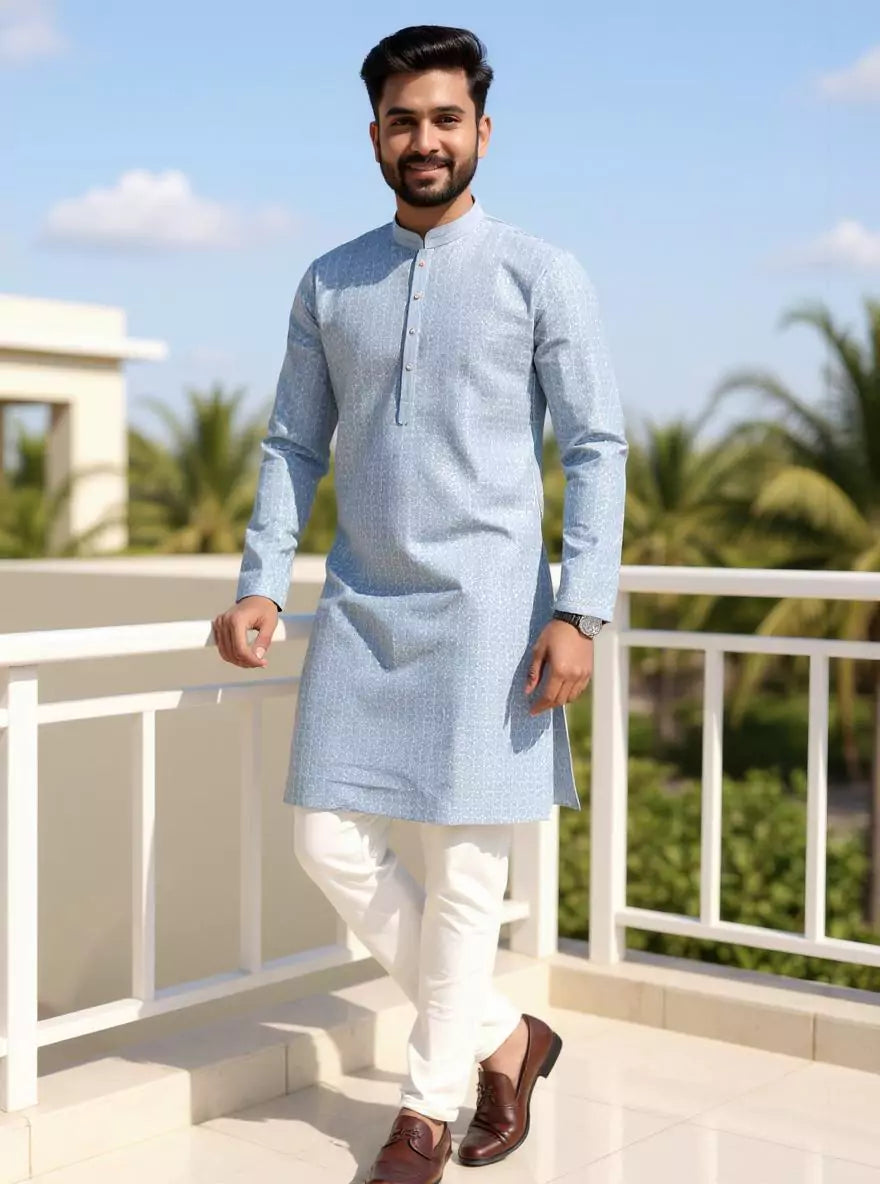 Stylish cotton silk Kurta with fine thread work, paired with cream pyjama. Perfect for casual outings with a touch of tradition and comfort.