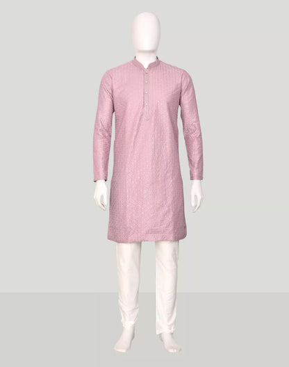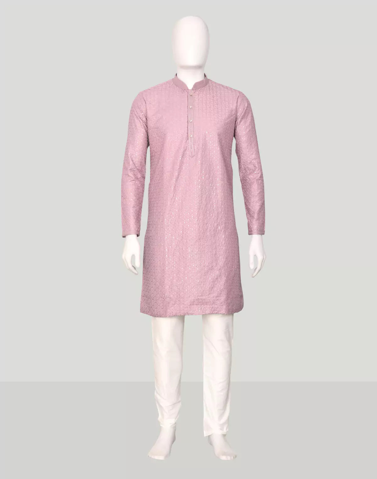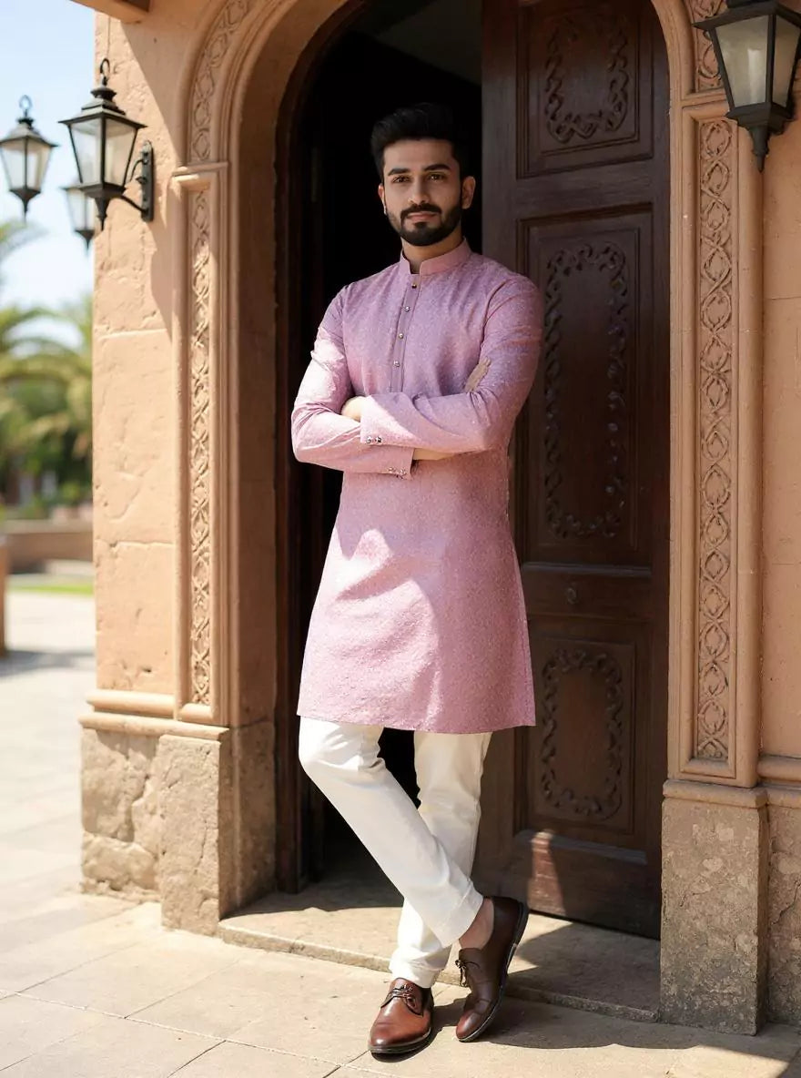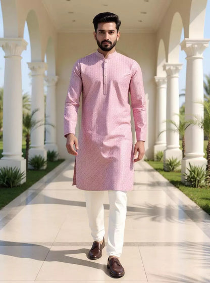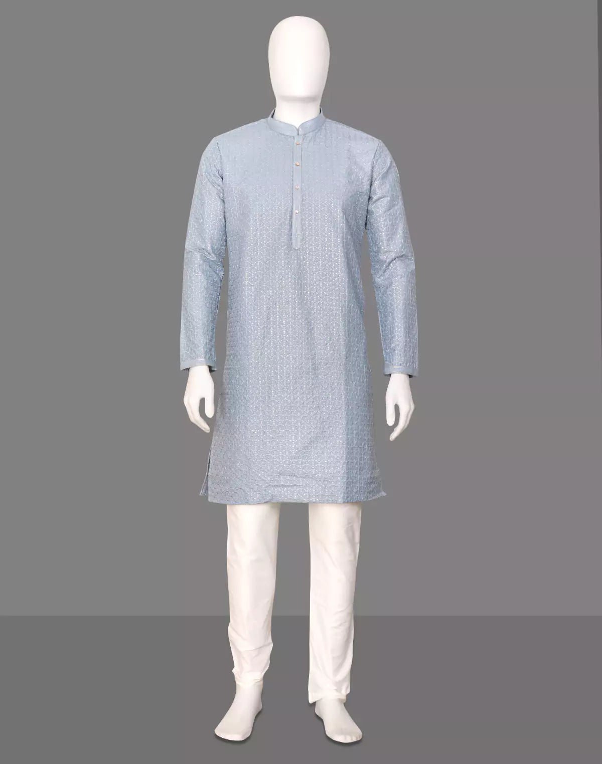 Stylish cotton silk Kurta with fine thread work, paired with cream pyjama. Perfect for casual outings with a touch of tradition and comfort.