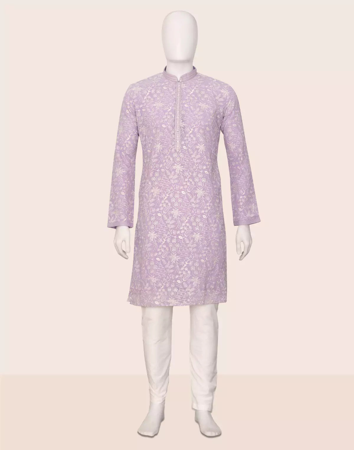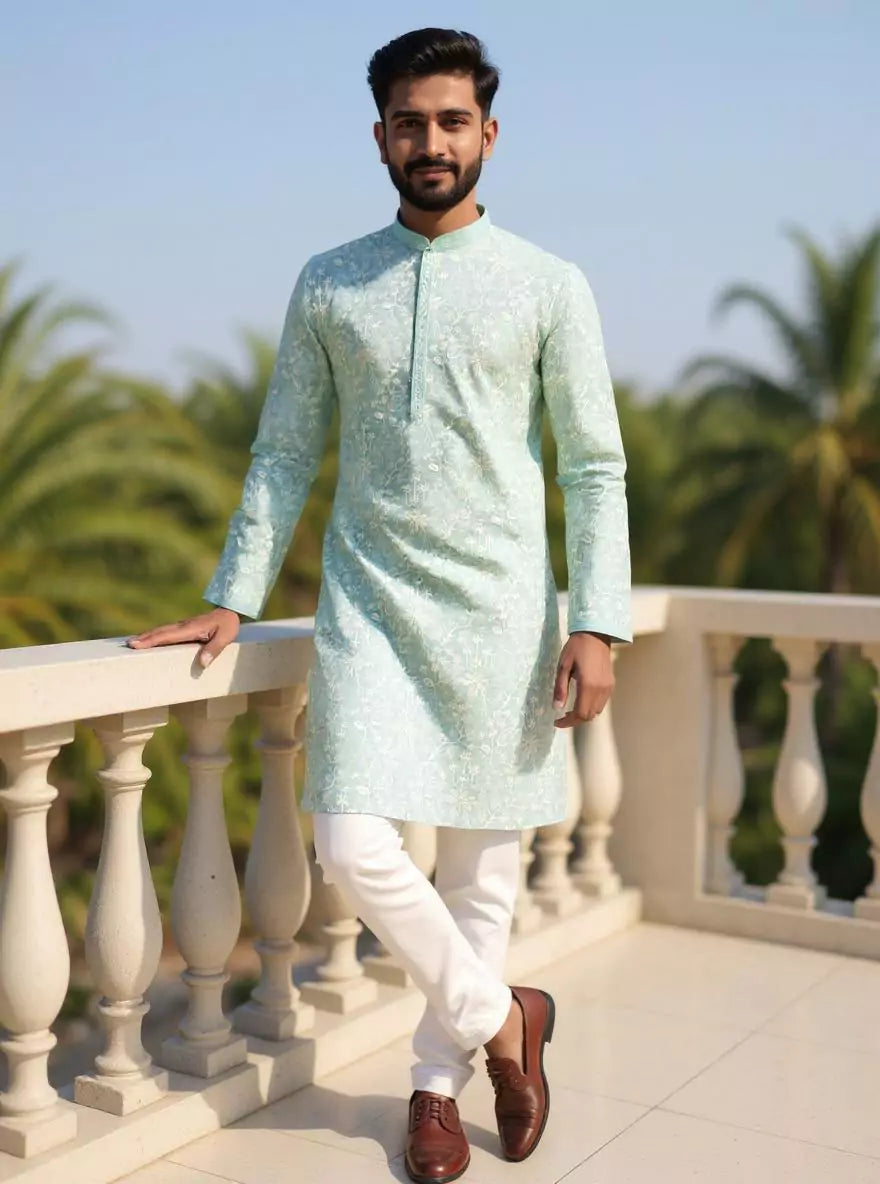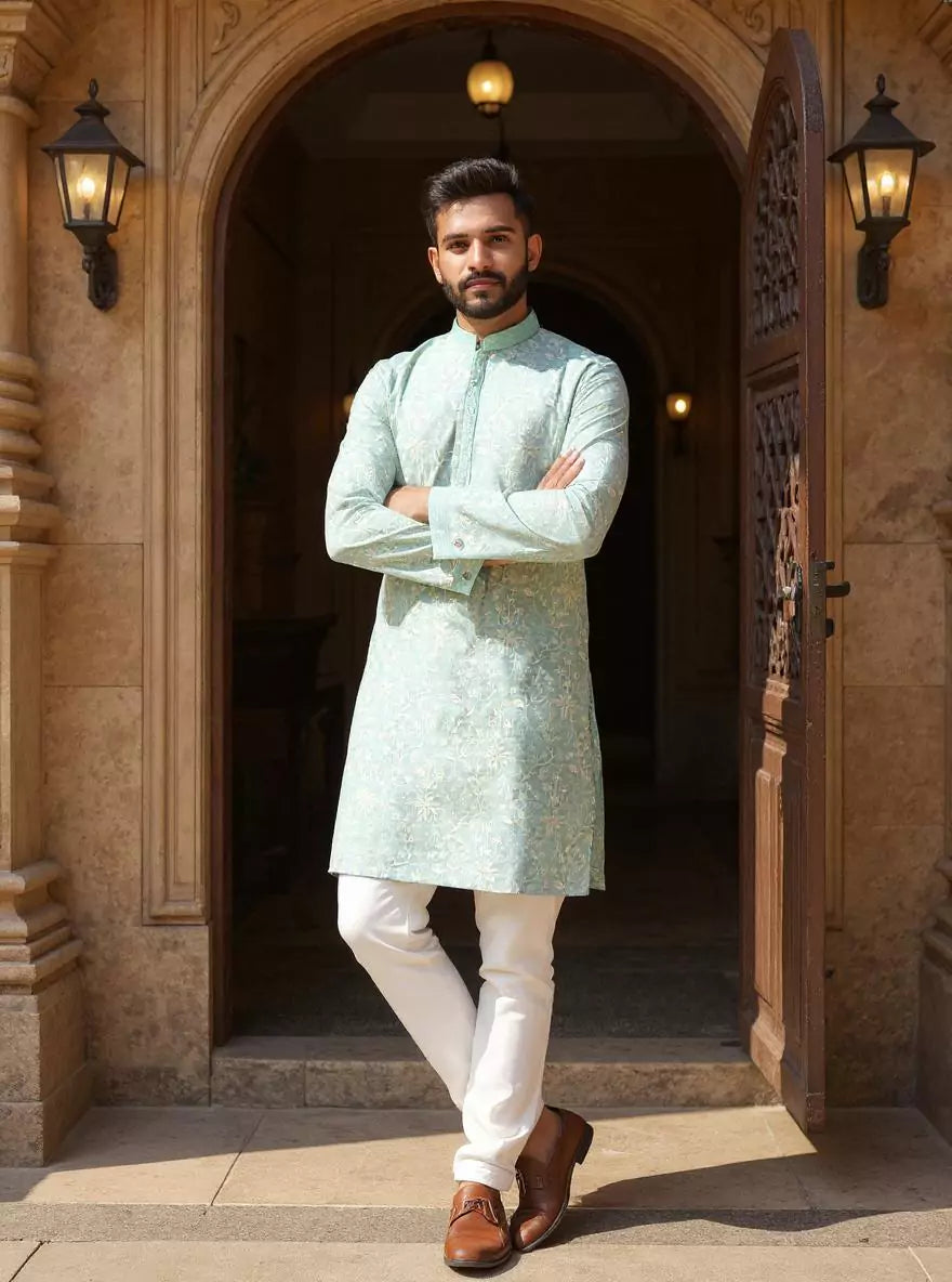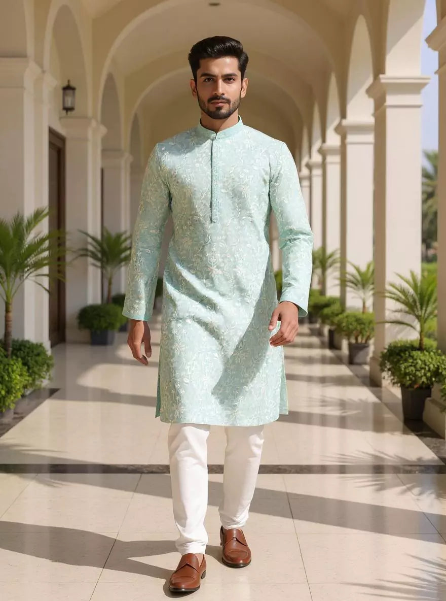 Grace meets charm in this georgette kurta adorned with delicate floral thread embroidery, paired with off-white pajama. Lightweight, elegant, and perfect for festive flair.