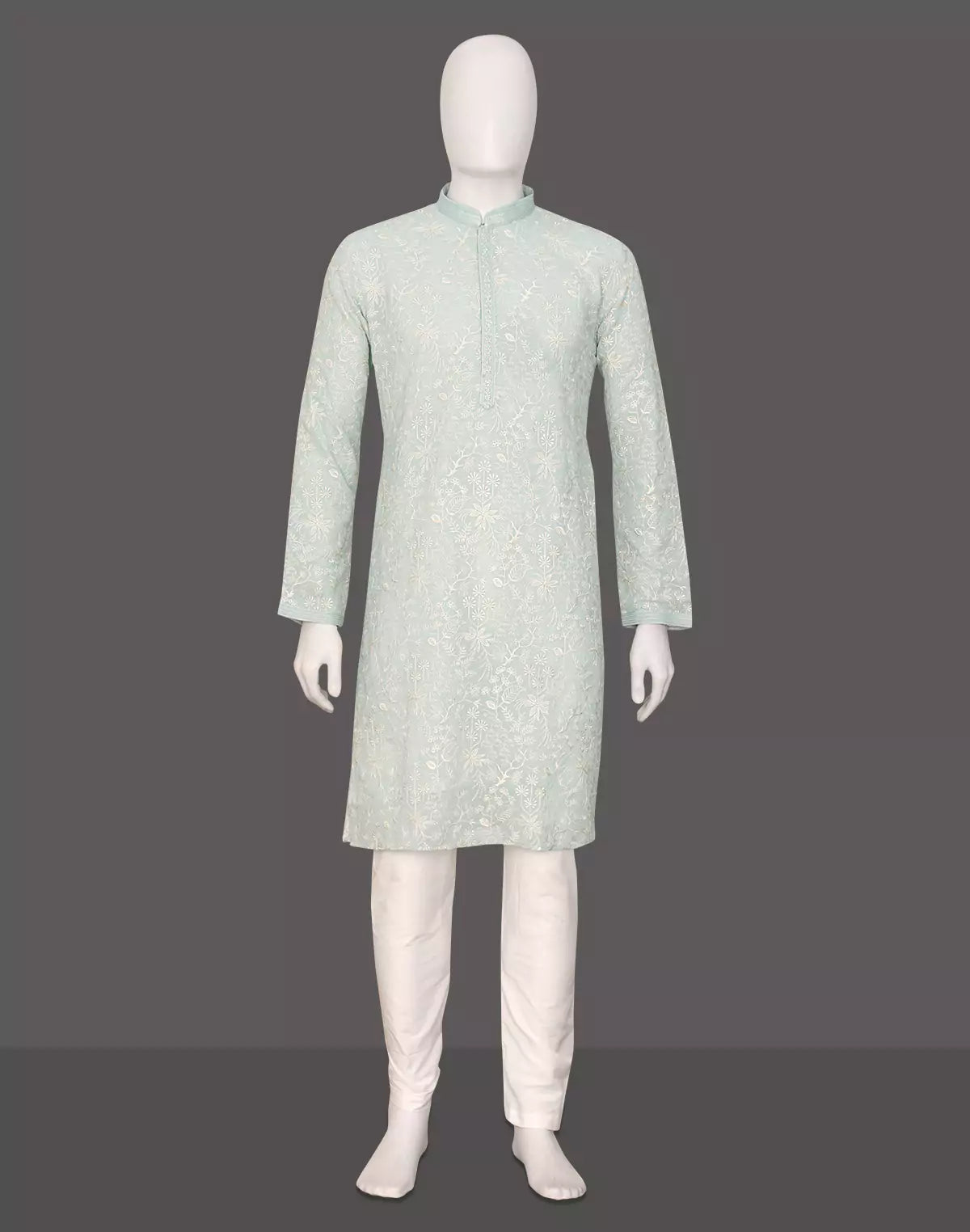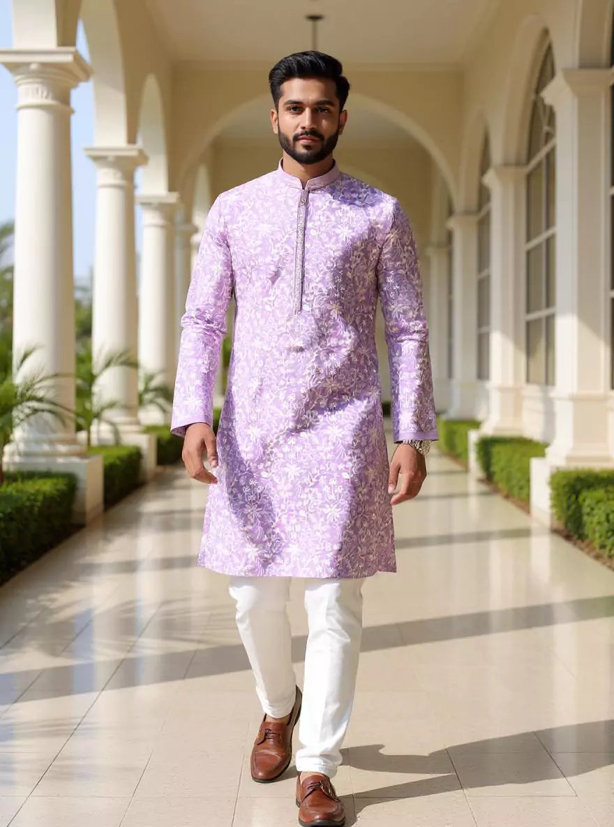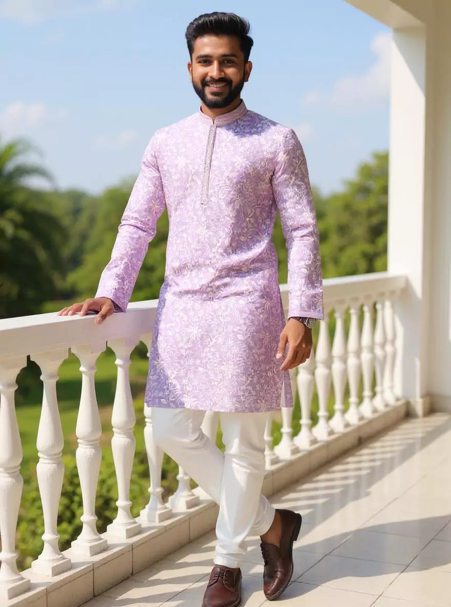 Grace meets charm in this georgette kurta adorned with delicate floral thread embroidery, paired with off-white pajama. Lightweight, elegant, and perfect for festive flair.