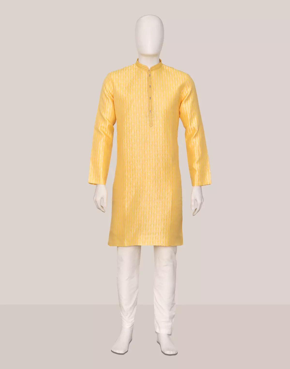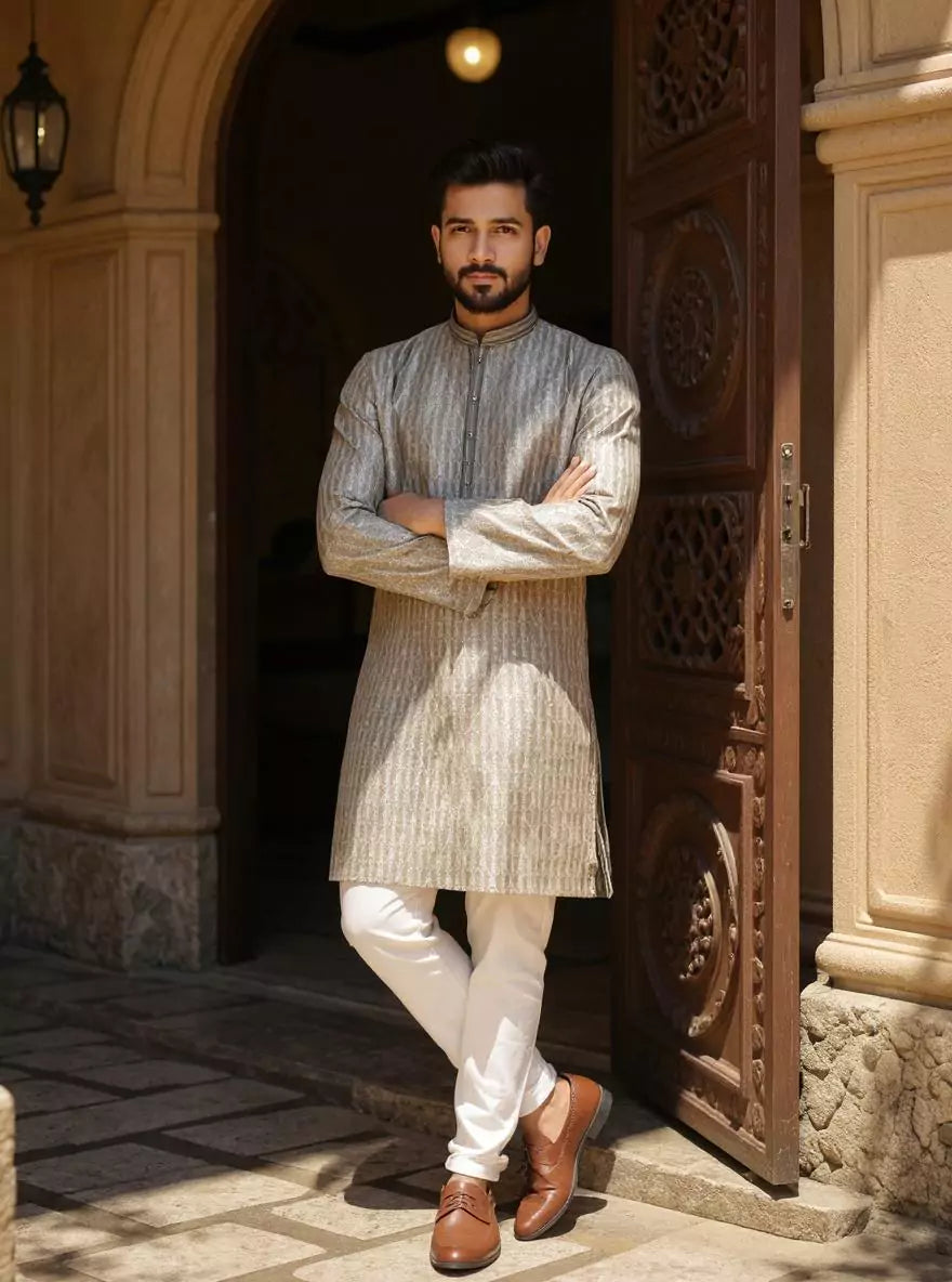 Elevate your style with this jacquard striped kurta, crafted using sustainable weaving techniques. Paired with off-white pajama, it blends tradition with conscious fashion.