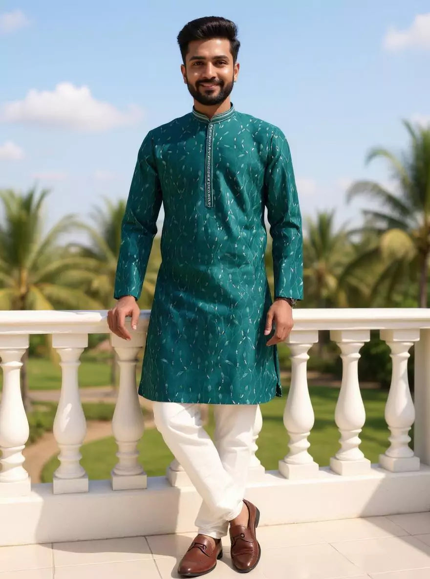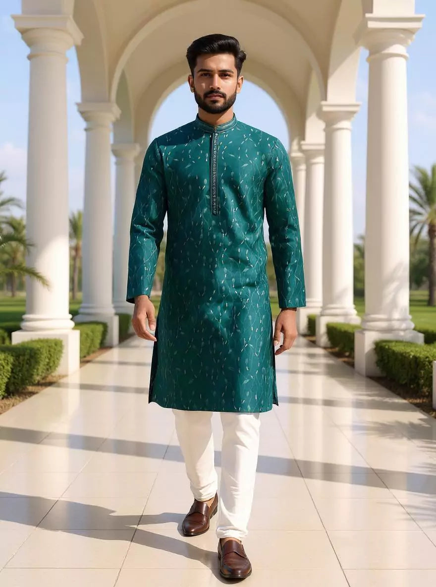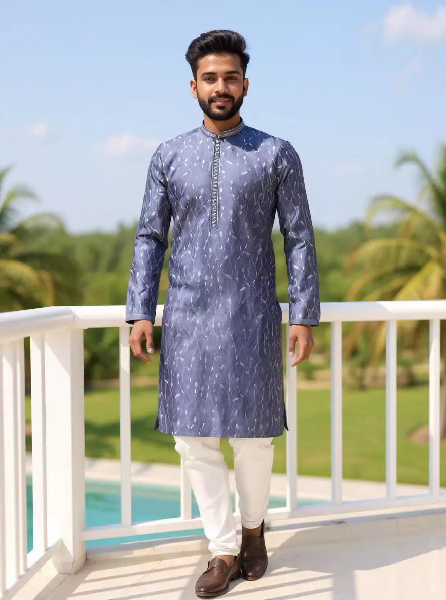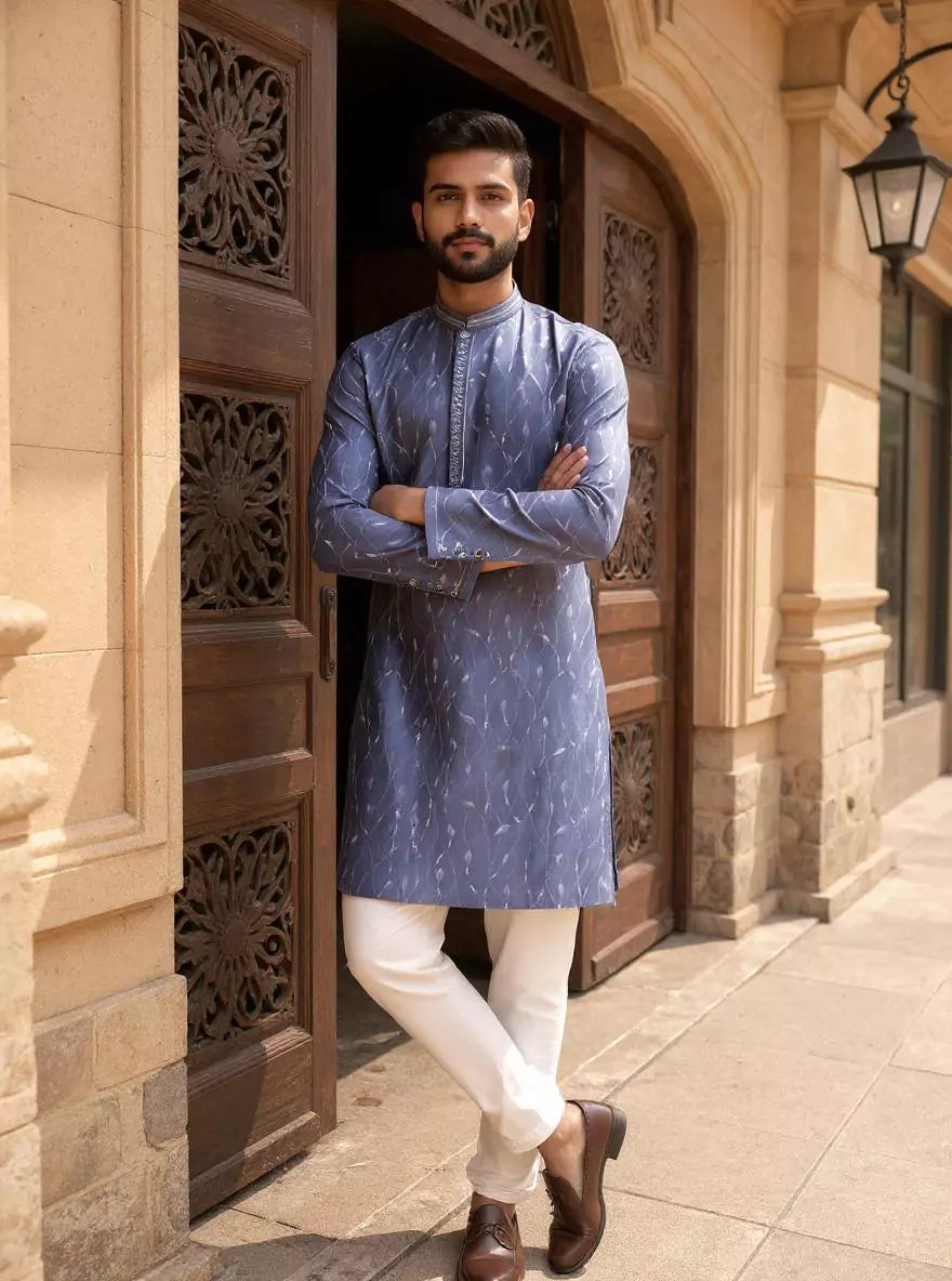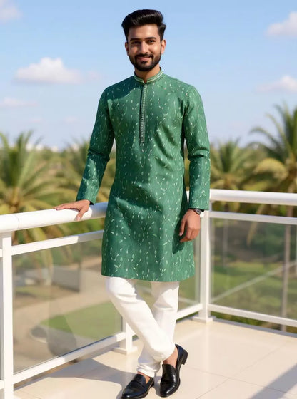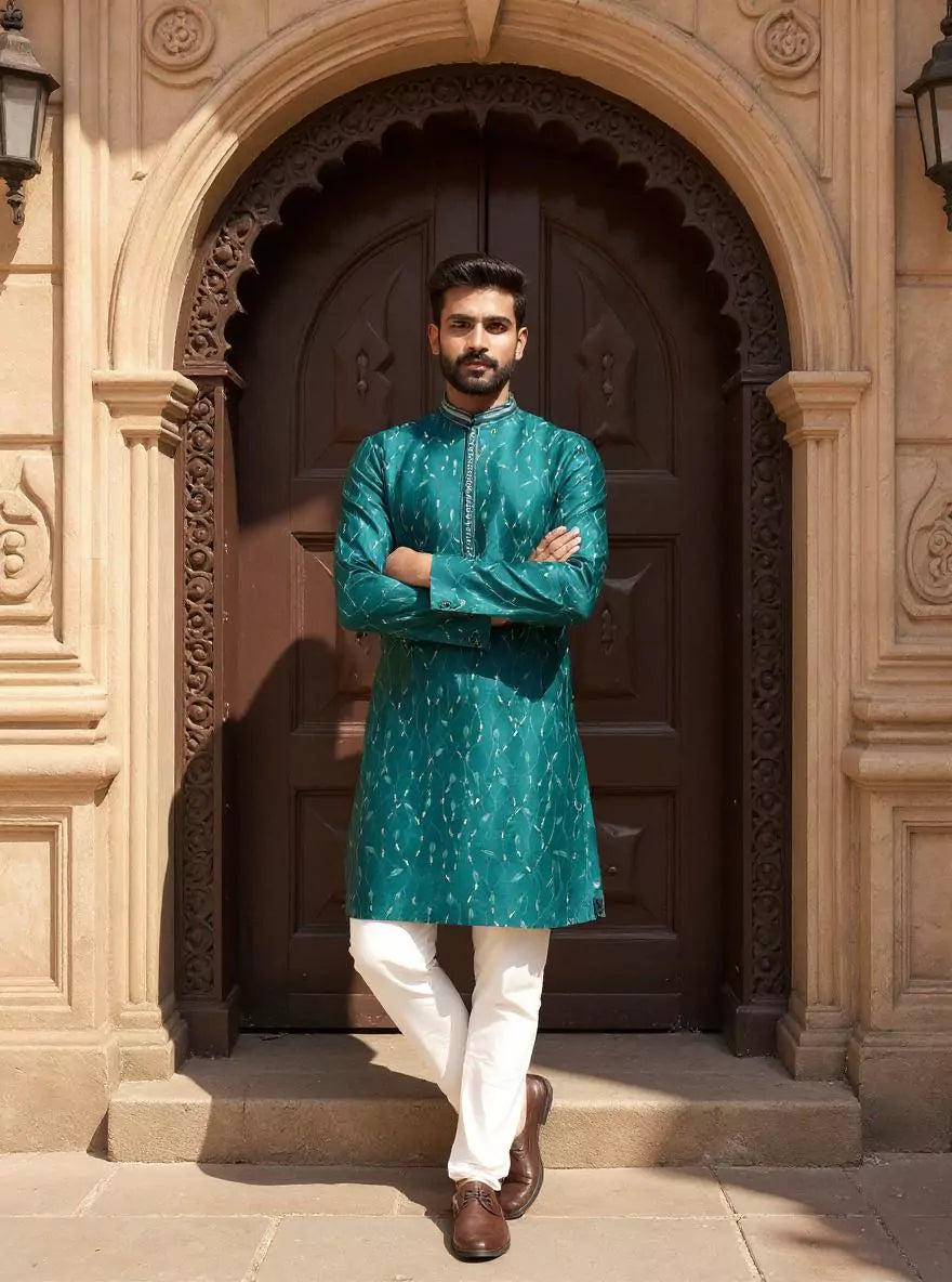 Stylish raw silk kurta with intricate floral embroidery, perfect for casual or party wear. Paired with comfortable off-white pajamas for a complete look.