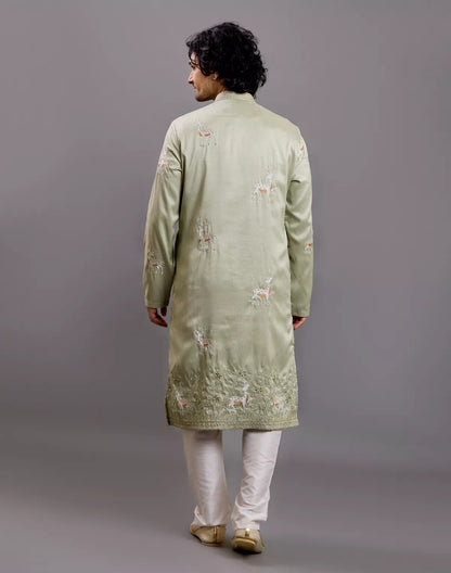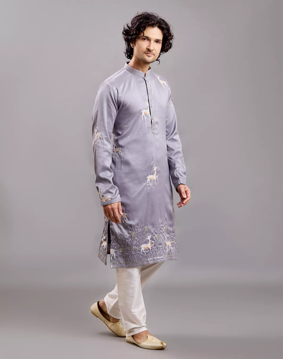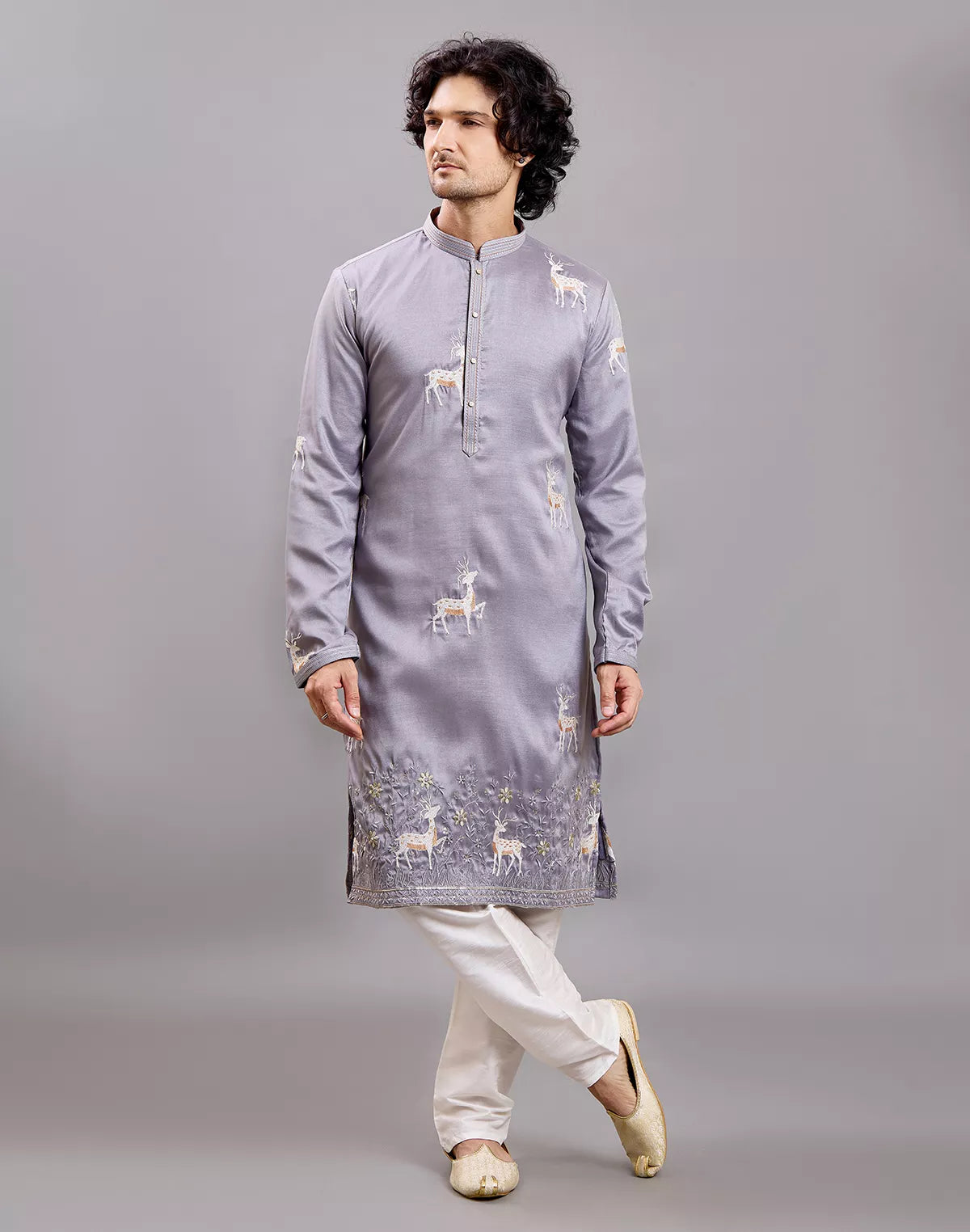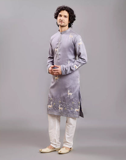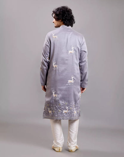 Shine gracefully this Grey Animal Kurta crafted from milky silk, adorned with delicate Embroidery work for a subtle sparkle. Paired with classic off white cotton pyjama for comfort and style.