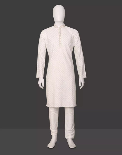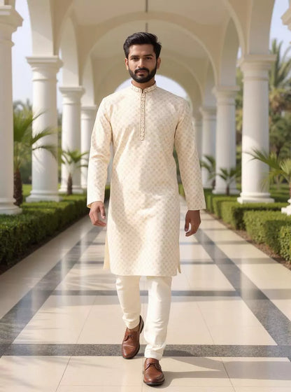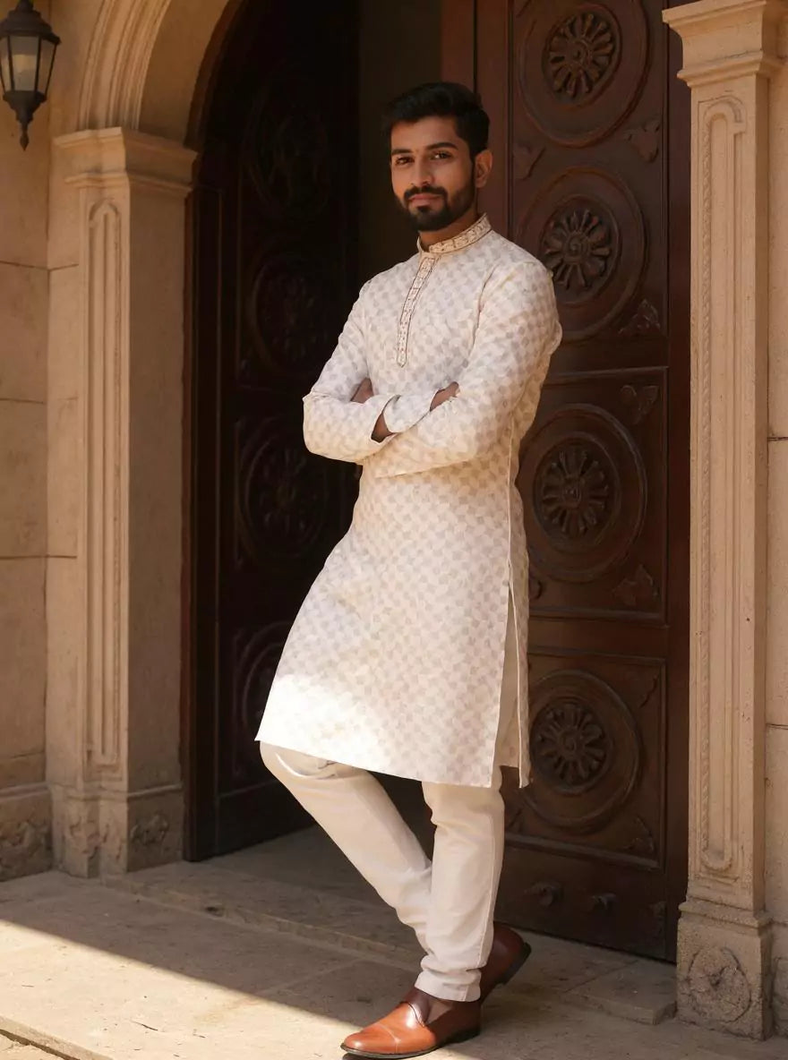 Nature-inspired botanical print on soft cotton kurta paired with classic off-white pajama—fresh, earthy, and effortlessly stylish. Perfect for serene day events and casual charm.