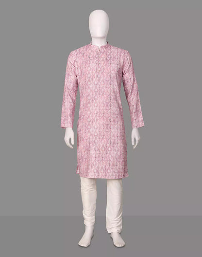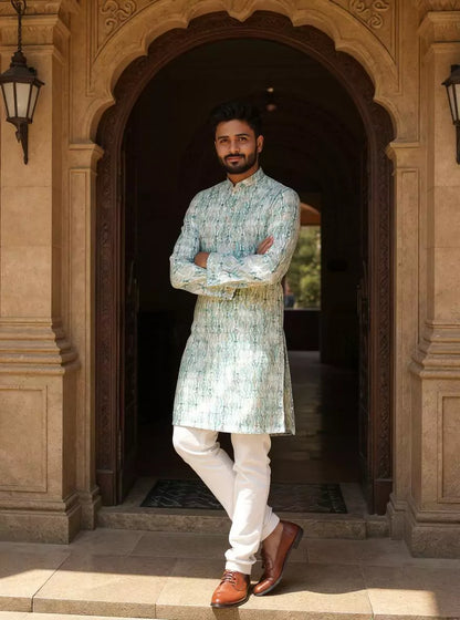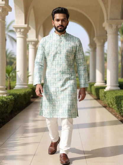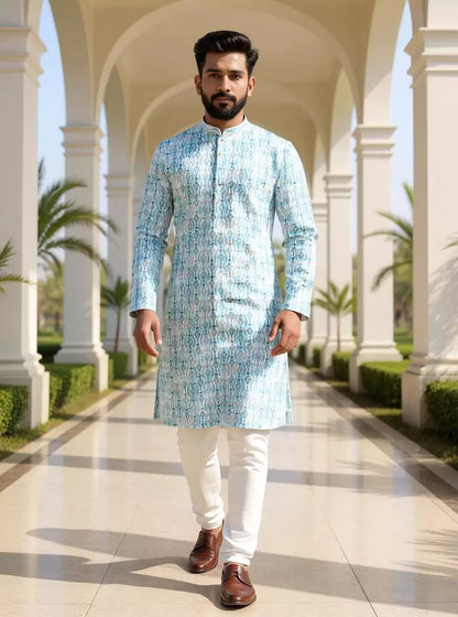 Graceful floral printed cotton kurta paired with timeless off-white pajama—effortlessly stylish and breezy, perfect for cheerful daytime occasions or relaxed festive gatherings.
