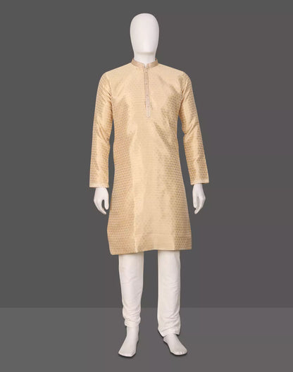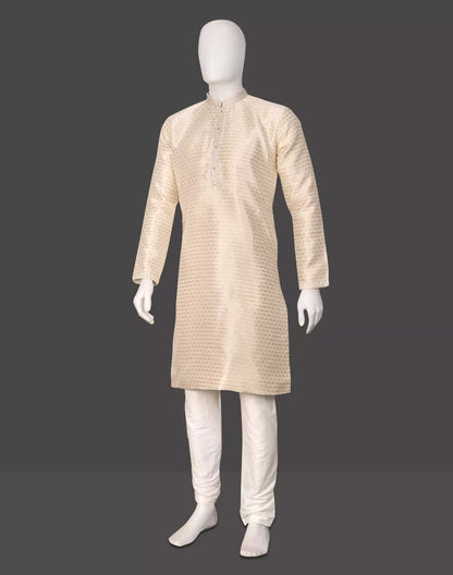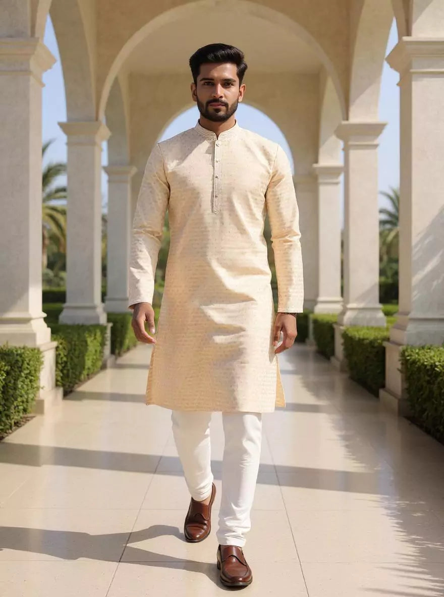 Step into elegance with this Jacquard Floral Zari Kurta featuring intricate weaving, paired with an off-white pajama. Ideal for weddings, festivals, and special events.