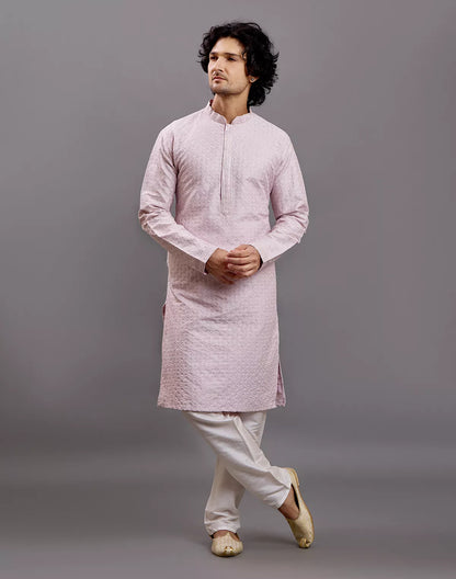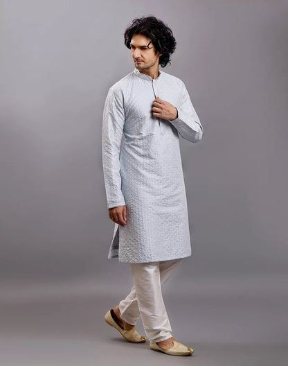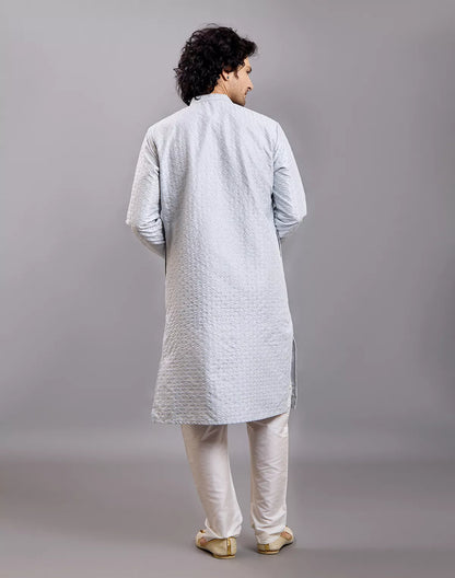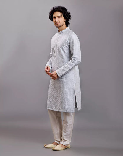 Stylish cotton silk Kurta with fine embellished work, paired with off white pyjama. Perfect for casual outings with a touch of tradition and comfort.