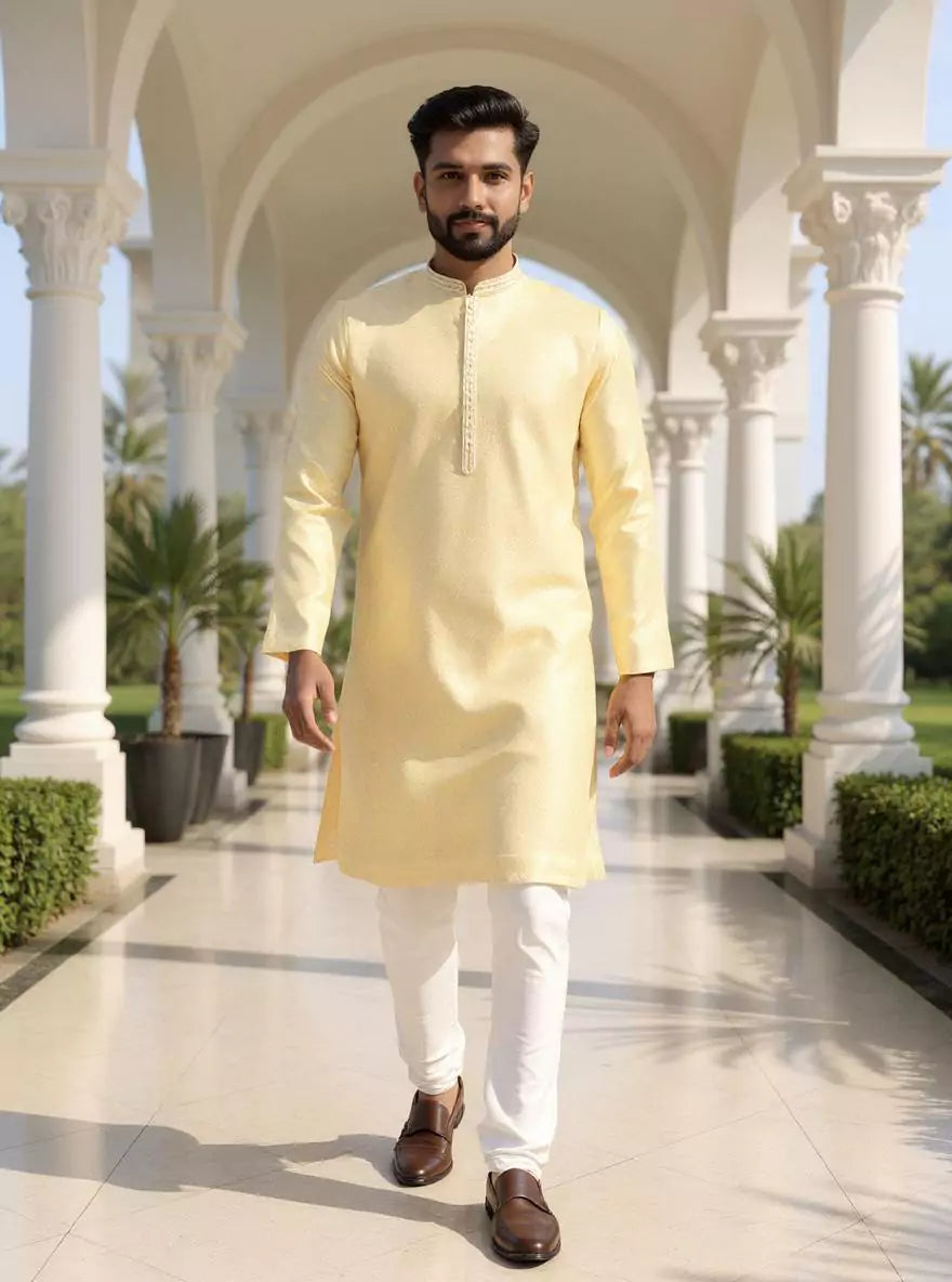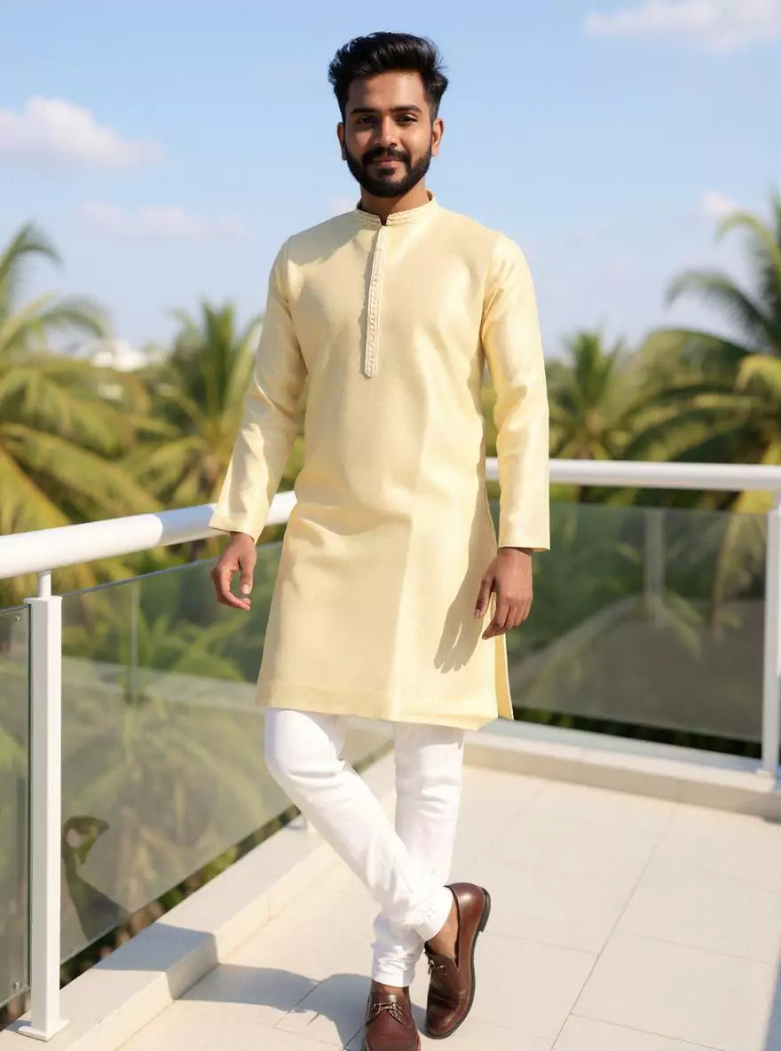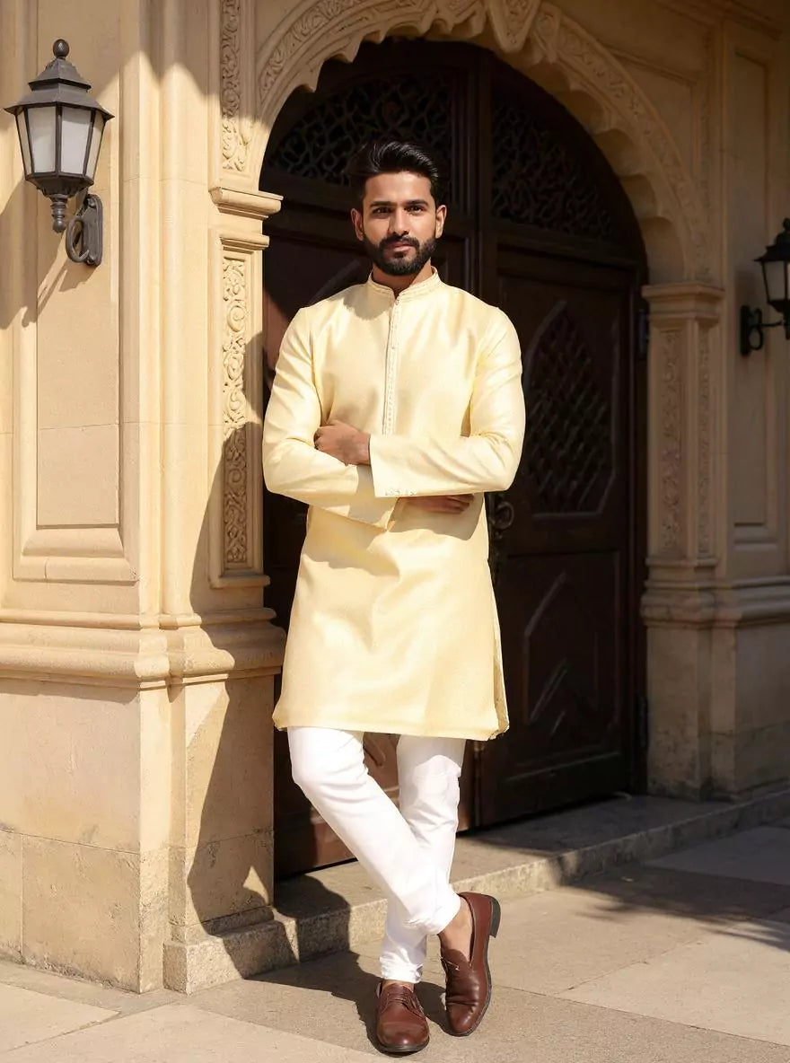 Self-patterned Jacquard Kurta for casual wear, paired with cream pajama. A perfect blend of subtle texture, comfort, and classic style for everyday elegance.