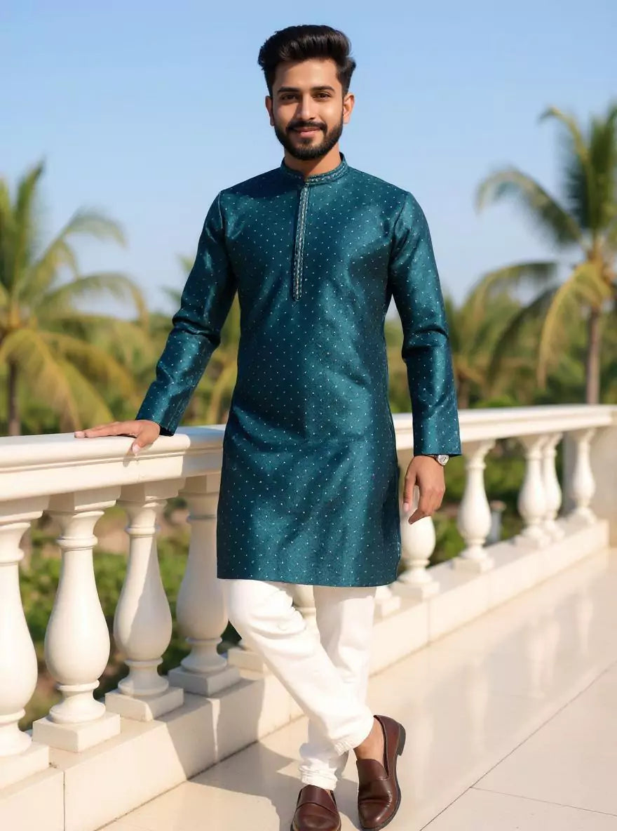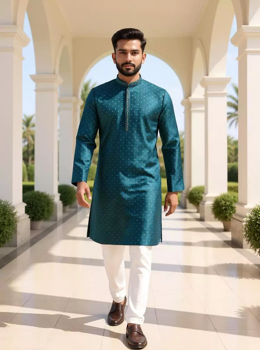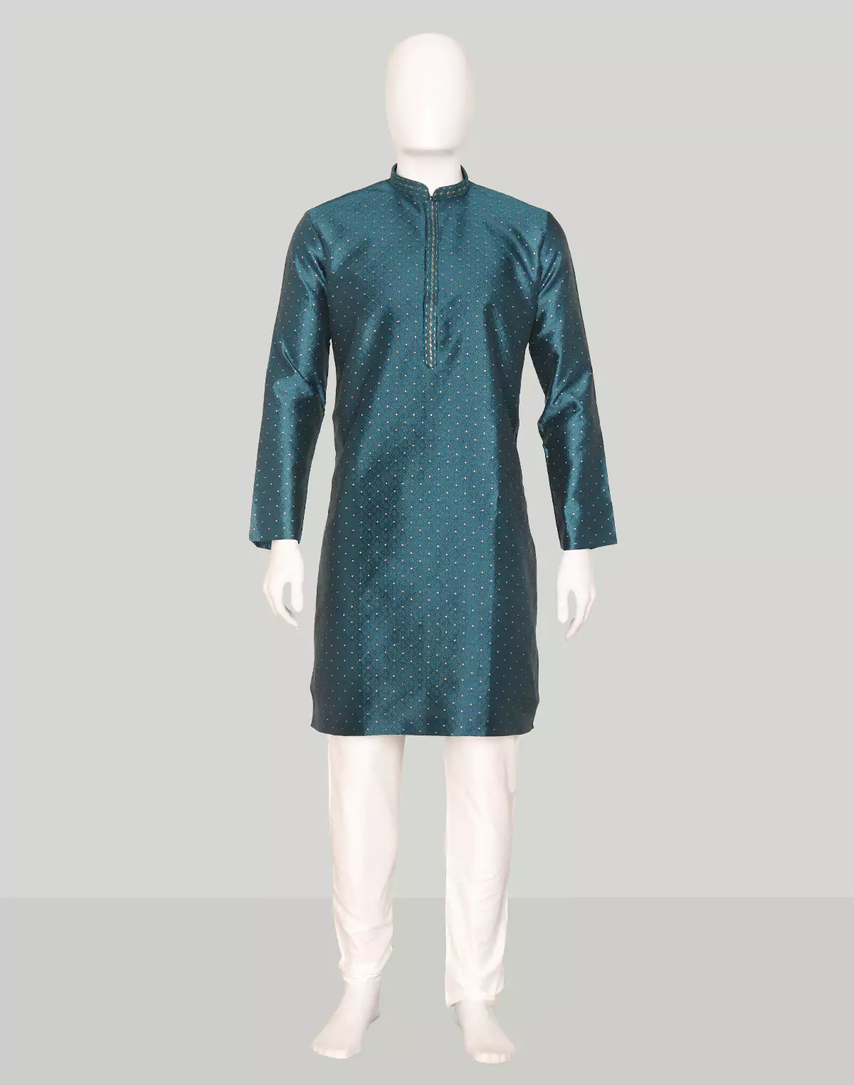 Self-patterned Jacquard Kurta for casual wear, paired with cream pajama. A perfect blend of subtle texture, comfort, and classic style for everyday elegance.