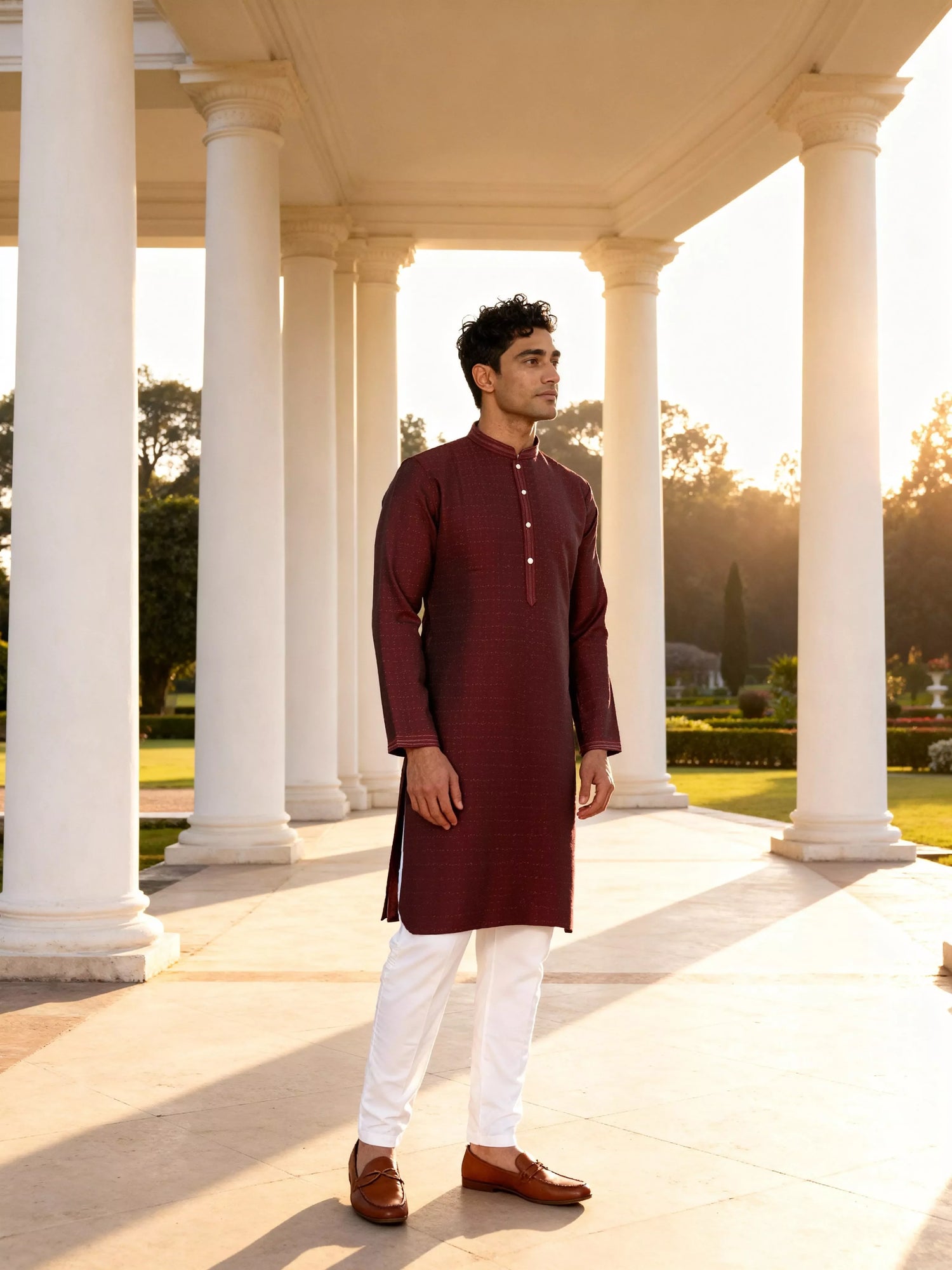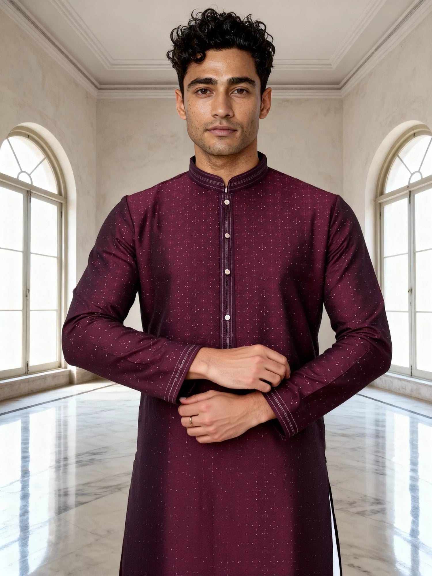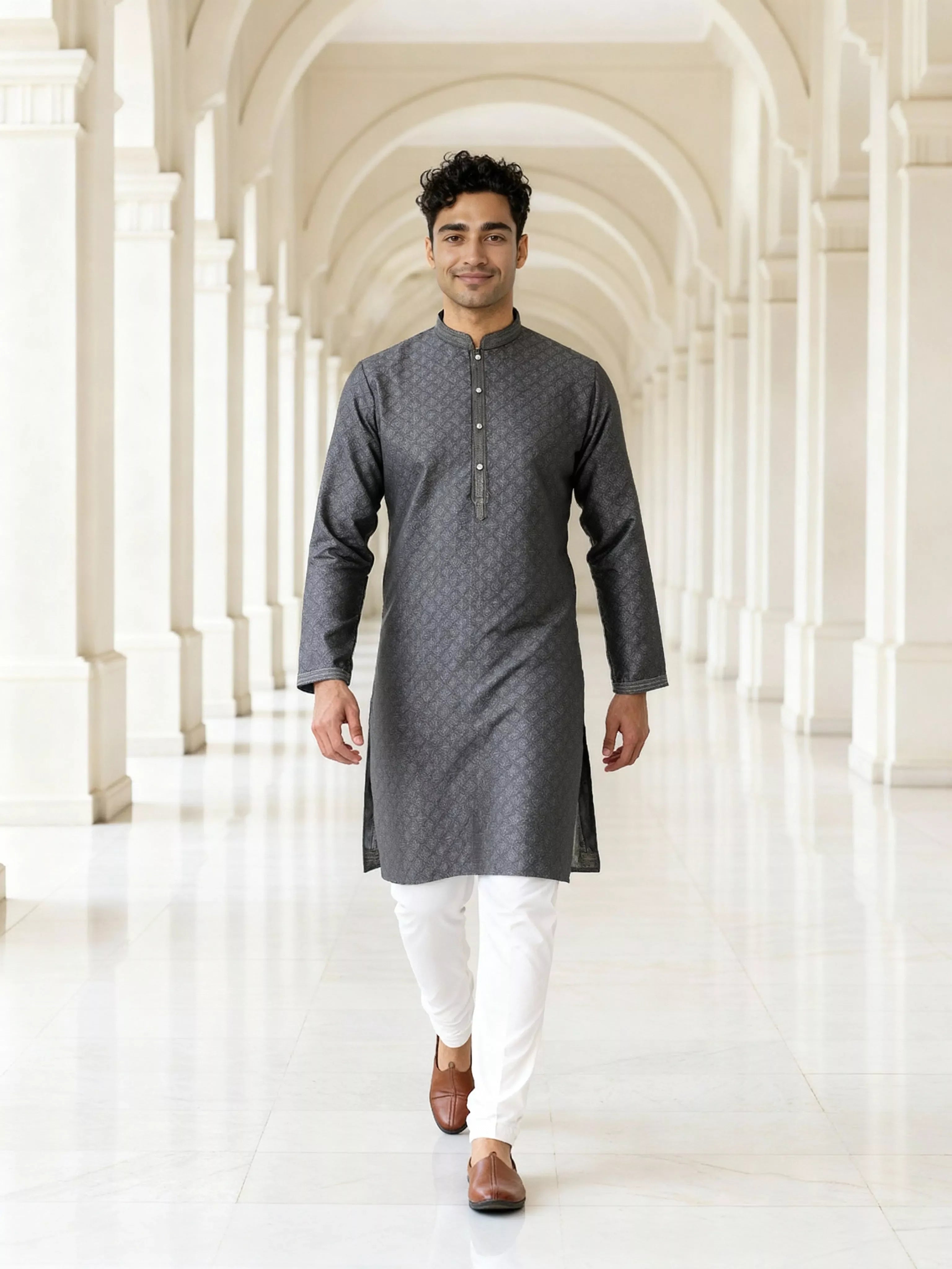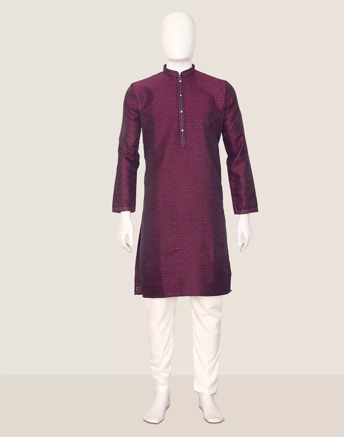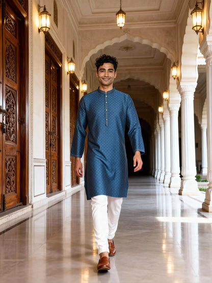 Elegant self-patterned jacquard kurta paired with classic off-white pyjama. Perfect for festive occasions or parties, offering a rich traditional look with modern flair.
