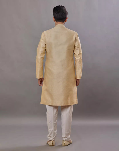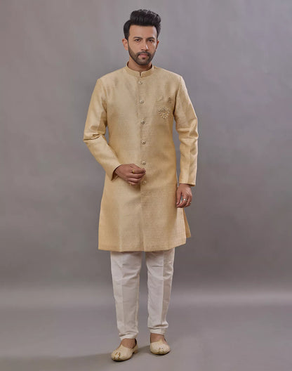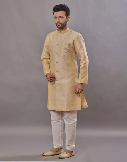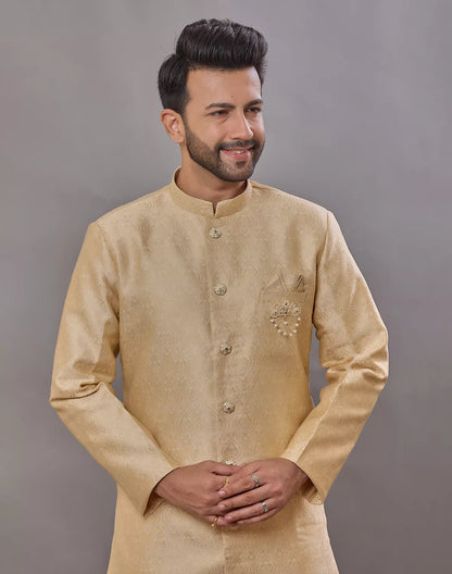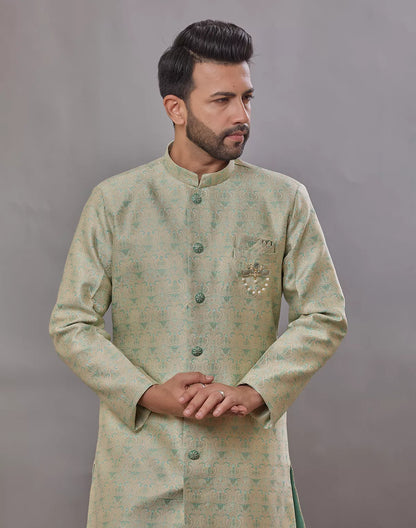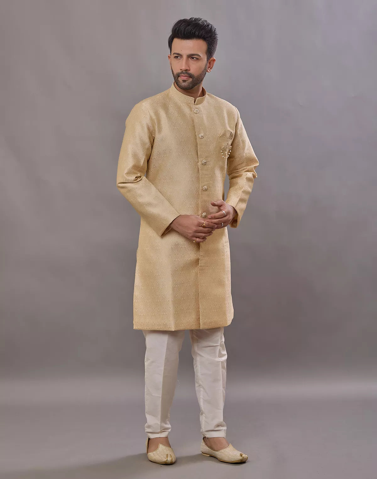 Embrace festive charm in this floral self weaving design Jacquard semi-indo with off-white pyjama. A graceful and vibrant choice for party wear.